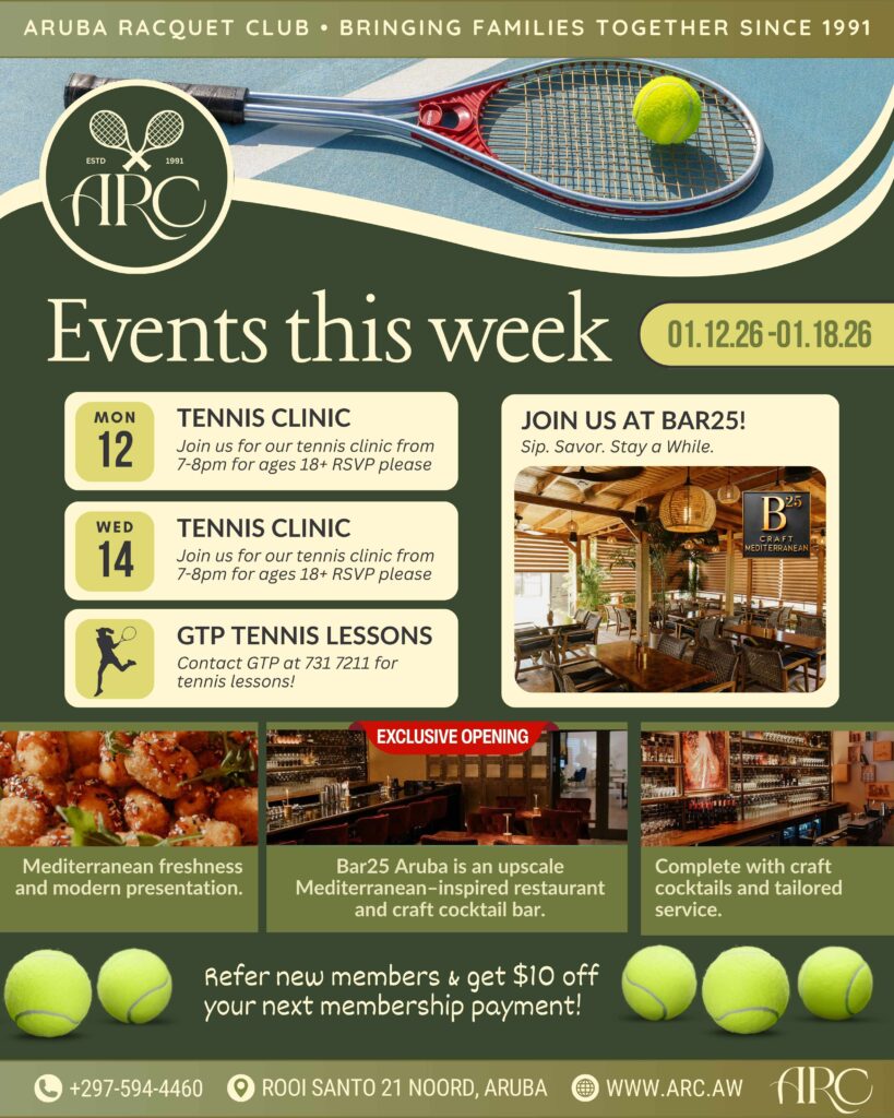 8:00 am – 9:00 am Local Private Lesson (Court 5) Aruba Racquet Club Contact: Aruba Racquet Club