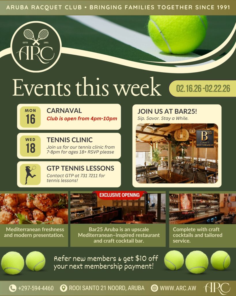 8:00 am – 9:30 am Singles (Court 1) Aruba Racquet Club Contact: Aruba Racquet Club