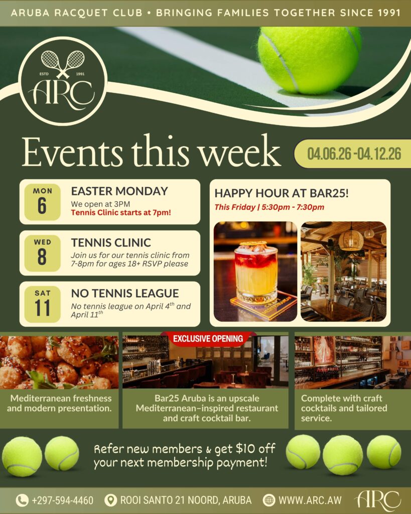 9:00 am – 10:00 am Singles (Court 4) Aruba Racquet Club Contact: Aruba Racquet Club
